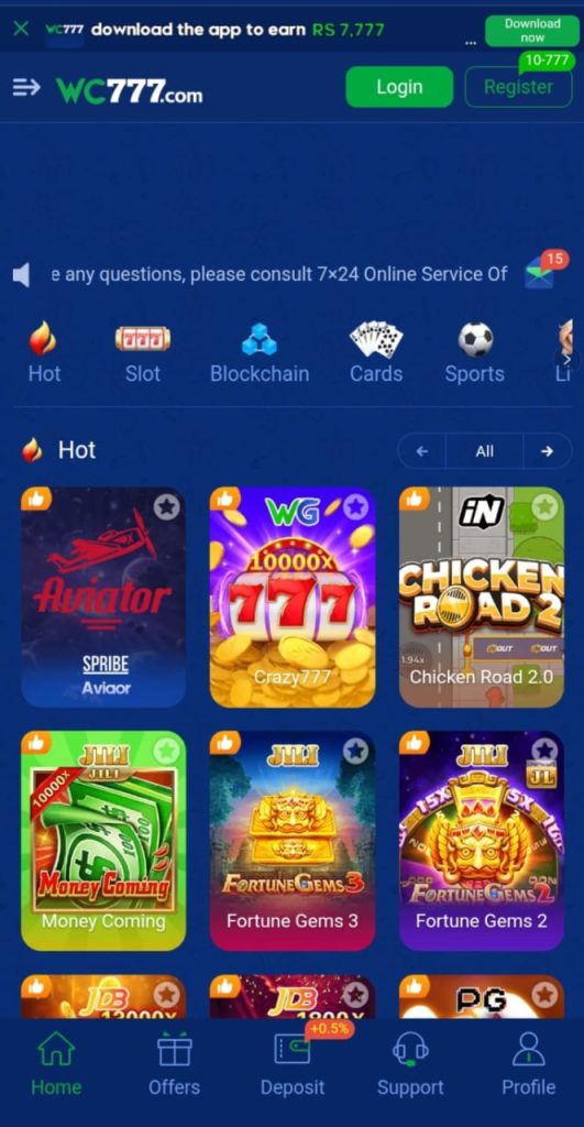 This WC777 Game allows users to earn money by playing games.